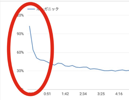 動画の視聴時間(横軸)と、視聴維持率(縦軸)です。20秒も経てば半分近くの人は観るのをやめていることを示しています。