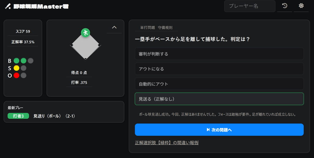 打撃編、守備編、走塁編、投手編、記録編、審判編、特例・試合運営編がありますが、それらをランダムに出題し、4拓問題にしました。ハードルを上げるために、正解なしボタンも作りました。