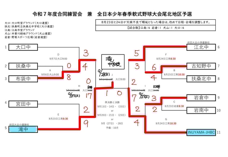 この尾北予選の代表チームが、11月の県大会に出場し、県大会で3連勝して決勝に残った2チームが3月の全国大会出場という流れ。